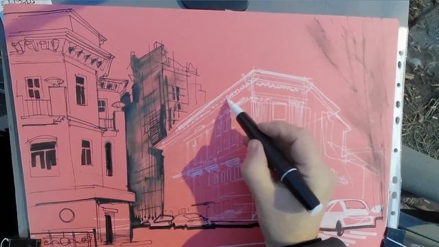 Городская зарисовка с натуры акриловыми и акварельными фломастерами В реальном времени +Digital edit
