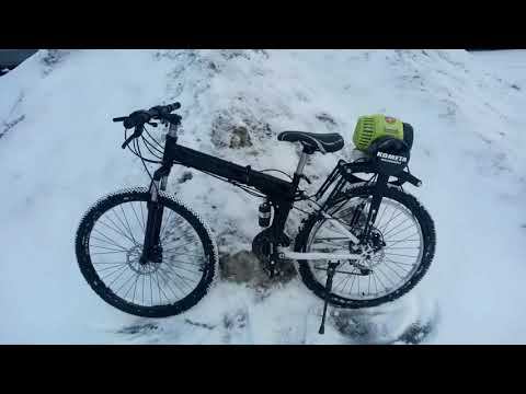 Сайт http://velokometa.ru/ Отчёт об установке мотпривода Комета на велосипед с полным мягким подвесом всех колёс. Велосипед складной. Мотор использован четырёхтактный. Снежный ведомый шкив.