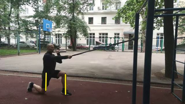 Выпад назад с горизонтальной тягой резины