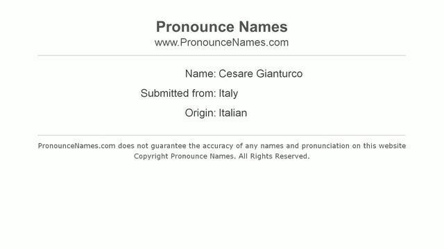 Audio and video pronunciation of Cesare Gianturco brought to you by Pronounce Names (http://www.PronounceNames.com), a website dedicated to helping people pronounce names correctly. For more information about this name, such as gender, origin, etc., go to http://www.PronounceNames.com/Cesare Gianturco