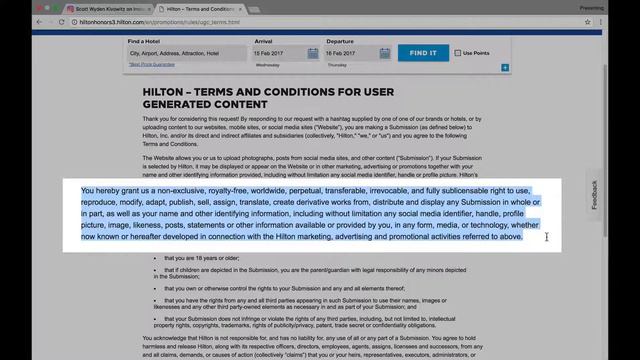 I shared a photograph on Instagram, tagged the hotel where the photo was made, and was asked if it was ok to repost the photo. That’s a normal thing which happens daily to thousands of people on Instagram. But Hilton linked to their terms and conditions for user generated content. What I read shocked me. By approving their use of your photo on Instagram, you’re also approving their use to sell and do anything they want with your photo, and even your profile and profile photo. I’m not a lawyer, but that’s how I interpreted it. Photographers beware. Check T&C before approving user generated content. SUBSCRIBE ➜ https://www.youtube.com/scottwyden?sub_confirmation=1 BLOG ➜ https://scottwyden.com COMMUNITY ➜ https://scottwyden.com/newsletter TWITTER ➜ http://twitter.com/scottwyden INSTAGRAM ➜ http://instagram.com/scottwyden FACEBOOK ➜ http://facebook.com/scottwyden MY CAMERA GEAR ➜ https://scottwyden.com/gear ALL ABOUT THAT GLASS ➜ https://scottwyden.com/glass Instagram photo ➜ https://www.instagram.com/p/BQeNGhejXDg Hilton T&C ➜ http://HiltonIGrules.com Legal Advice ➜ https://scottwyden.com/recommends/lawtog “You hereby grant us a non-exclusive, royalty-free, worldwide, perpetual, transferable, irrevocable, and fully sublicensable right to use, reproduce, modify, adapt, publish, sell, assign, translate, create derivative works from, distribute and display any Submission in whole or in part, as well as your name and other identifying information, including without limitation any social media identifier, handle, profile picture, image, likeness, posts, statements or other information available or provided by you, in any form, media, or technology, whether now known or hereafter developed in connection with the Hilton marketing, advertising and promotional activities referred to above.” This channel uses affiliate links for products and services recommended. Not always, but many times. For example, Amazon links will always be affiliate links. That means I make a tiny commission if you purchase the linked product. Want to improve your YouTube content? Check out TubeBuddy https://www.tubebuddy.com/scottwyden. It’s the tool I use to research titles, keywords, and do many other awesome optimization of each video.