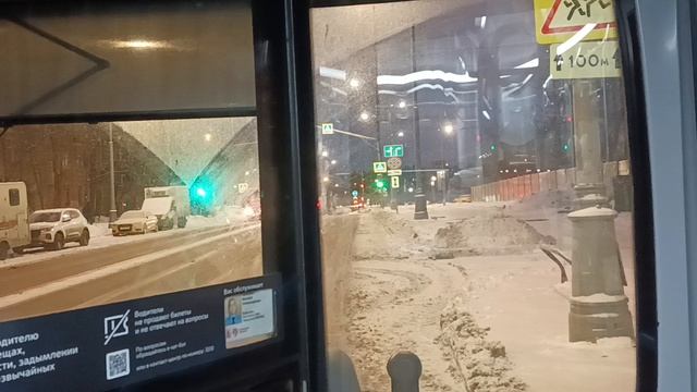 вечерняя зимняя поездка с видом из кабины водителя автобуса ЛиАЗ по маршруту 323 кинотеатр Байкал мц