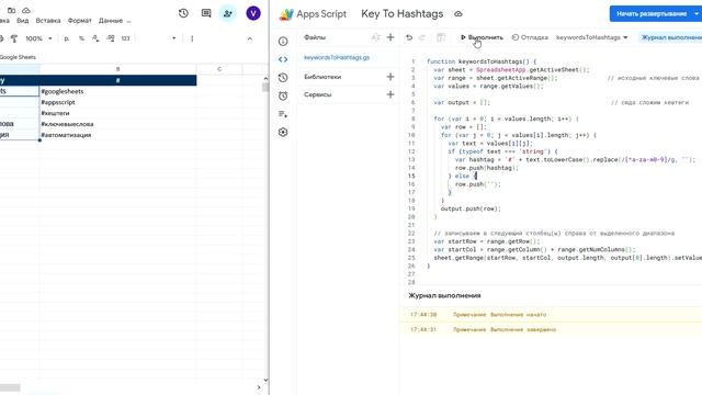 Небольшой лайфхак для тех, кто работает с контентом и рекламой 💼 Я настроил в Google Таблицах простой скрипт: берёшь список ключевых слов — а в соседнем столбце автоматически появляются аккуратные хештеги формата #googlesheets, #appsscript, #ключевыеслова ✨ Скрипт выложен у меня на канале в Telegram — можно забрать и адаптировать под свои задачи 📲 https://t.me/chestno_seo/16 #googleSheets #appsScript #хештеги #ключевыеслова #автоматизация #key #Script #ключи