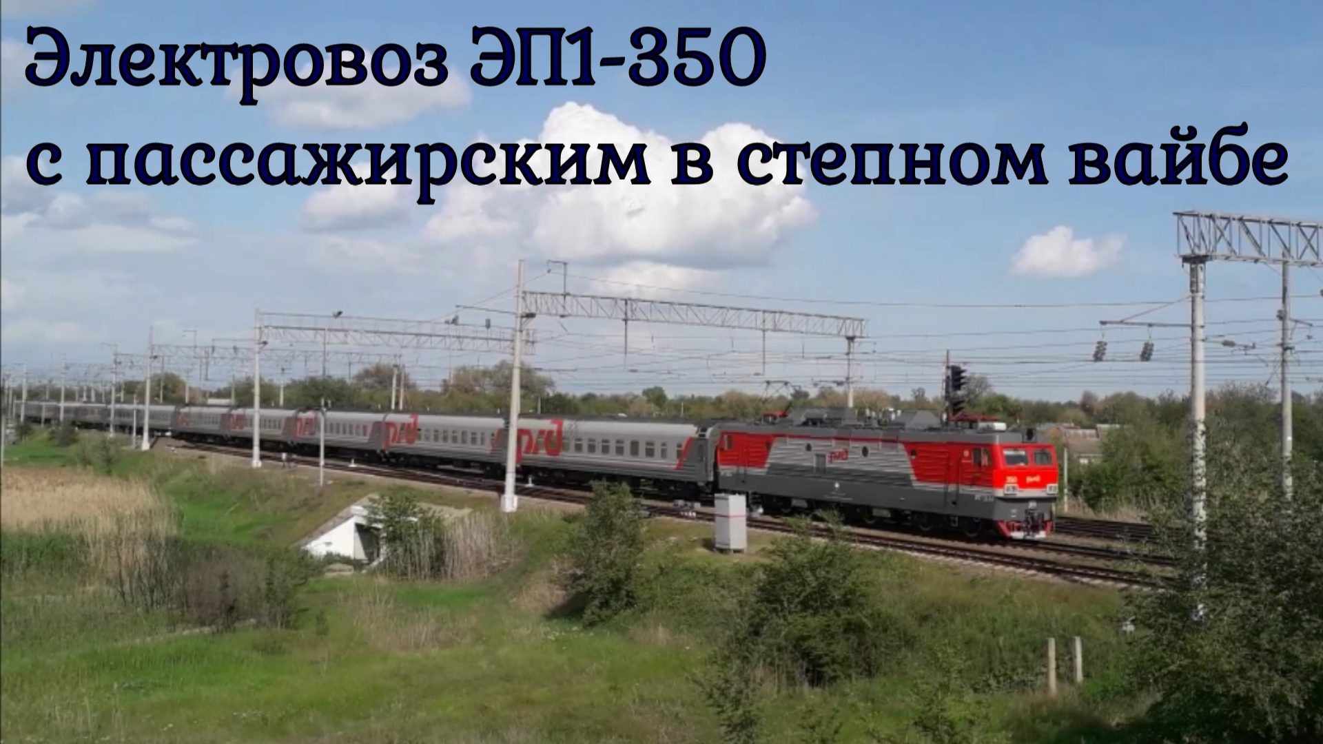 Электровоз ЭП1-350 (приписан ТЧЭ-11 Саратов-Пассажирское ПРИВ) с поездом №127Ы Красноярск — Адлер заходит на станцию Пролетарская одноимённого города Пролетарск (ранее станица Великокняжеская) Ростовской области. Обратите внимание на небо и облака и общую степную картину. Обзорный вид поезда отлично сочетается с таким пейзажем.