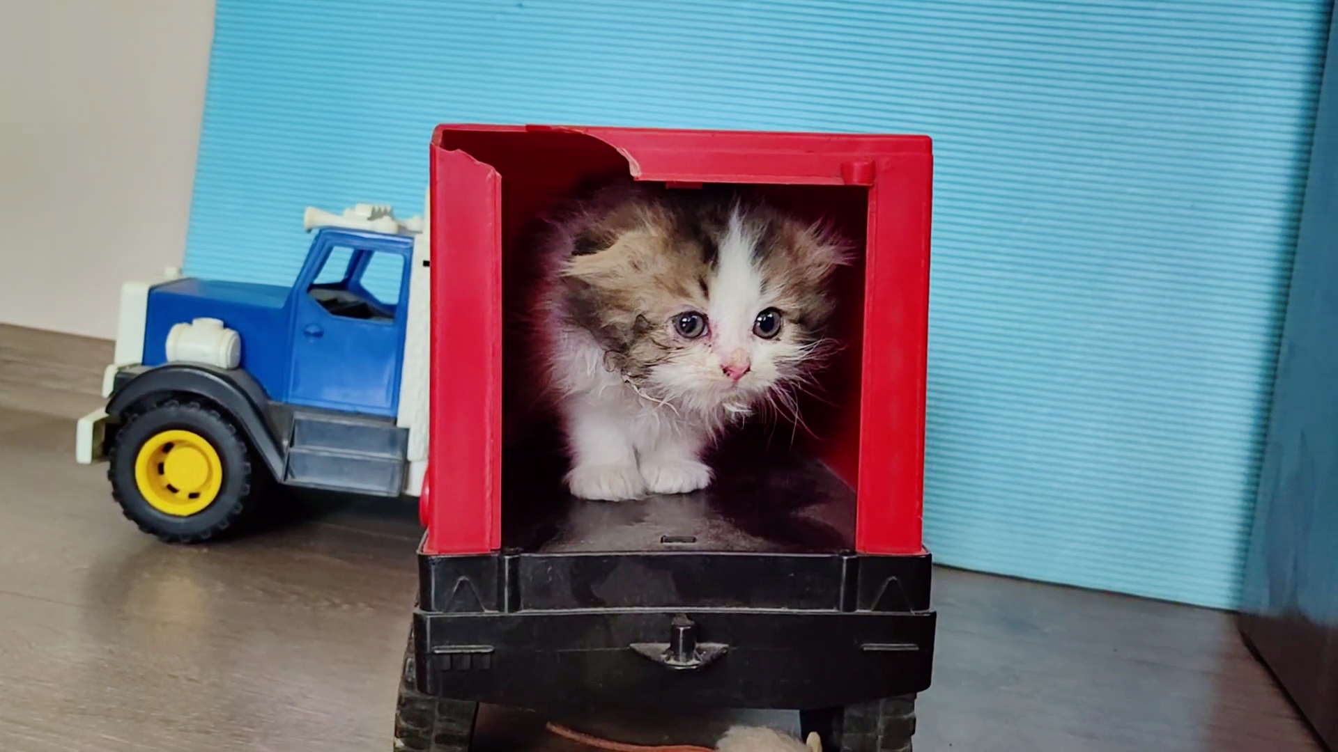 Детский грузовик и первые шаги маленького котенка. 4к