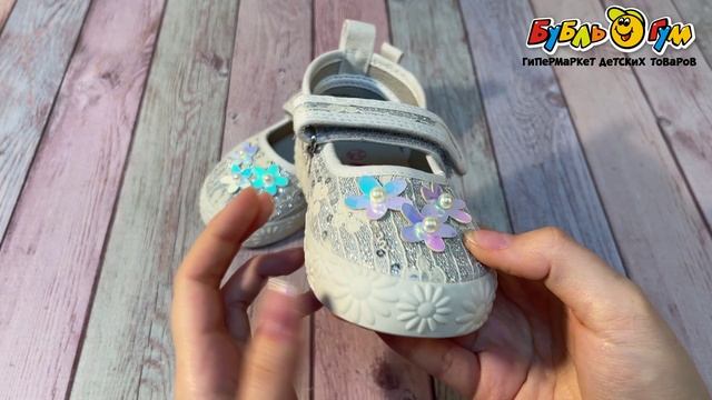 327246 Туфли Pasito на липучке блестящие с декоративными цветами серебряные