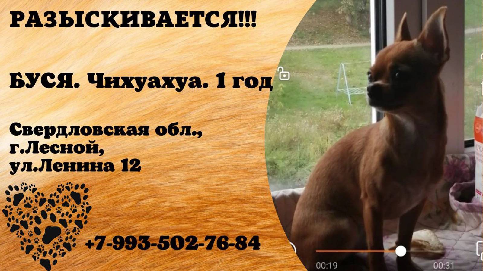 Свердловская Лесной Пропала собака 28.09 Всем добрый вечер, потерялась собака, чихуахуа, девочка, рыже-золотистый окрас, кличка Буся, хвост не купирован, белая грудь, 1 год. Поиски длятся уже сутки, никакой информации нет, если кто то что то знает или приютил, дайте знать, звоните на телефон 89935027684, собака очень дорога для нас, хотелось бы побыстрее найти. Вознаграждение 10000р Инфо: https://vk.com/wall-198815410_154948