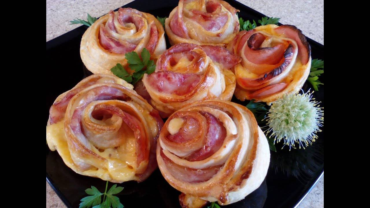 Розы из слоёного теста с ветчиной и сыром! Слойки розы, рецепт!