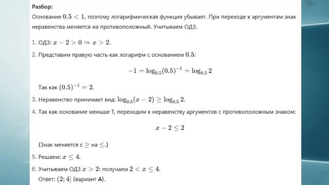 Определение логарифмического уравнения. Методы решения: приведение к одинаковому основанию, потенцирование, замена переменной. Теорема о равносильности: log_a f(x) = log_a g(x) ⇔ f(x) = g(x) ﹥ 0. Логарифмические неравенства. Свойство монотонности: при a ﹥ 1 log_a f(x) ﹥ log_a g(x) ⇔ f(x) ﹥ g(x) ﹥ 0; при 0 ﹤ a ﹤ 1 знак неравенства меняется. Подготовка и обучение школьников с помощью ИИ: https://sdavalka.ru/. Как работать? - Зарегистрируйтесь. - Найдите нужный предмет и класс. - Изучите материалы по урокам: текст, понятный ученикам, сжатый видеоурок с ИИ. - Пройдите тренировочный тест (можно проходить бесконечно, для усвоения материала). - Уверены, сдавайте экзаменационный тест! - И так по каждой теме. - В конце итоговый тест. - Сдадите все - сдадите любой экзамен! Системы дистанционного образования, контент: https://ecre.ru/ Подготовка для ВУЗов и СУЗов: https://mexam.ru/