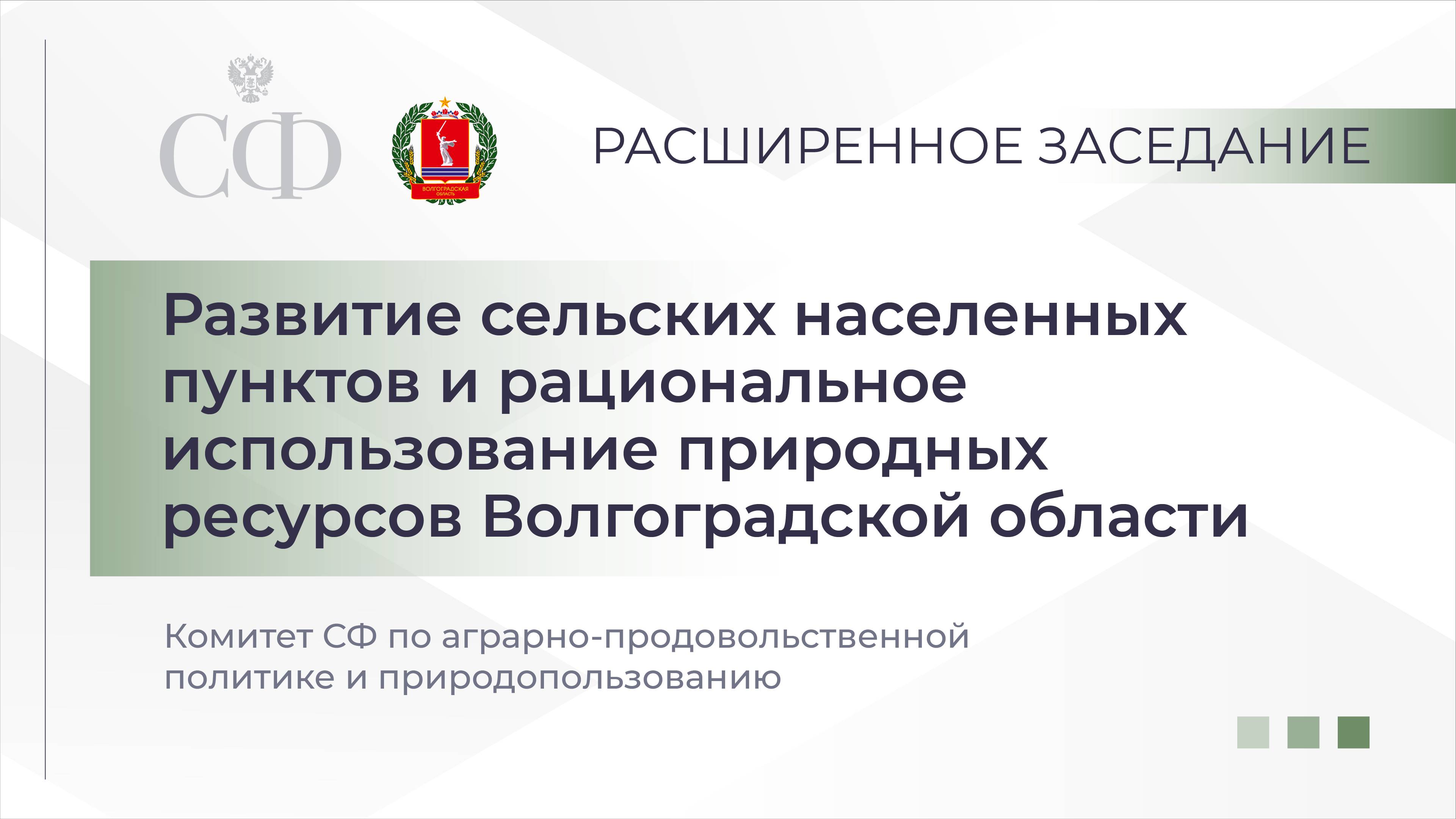 В верхней палате в рамках Дней Волгоградской области проходит расширенное заседание Комитета Совета Федерации по аграрно-продовольственной политике и природопользованию. Участники обсуждают развитие сельских населенных пунктов и рациональное использование природных ресурсов Волгоградской области.