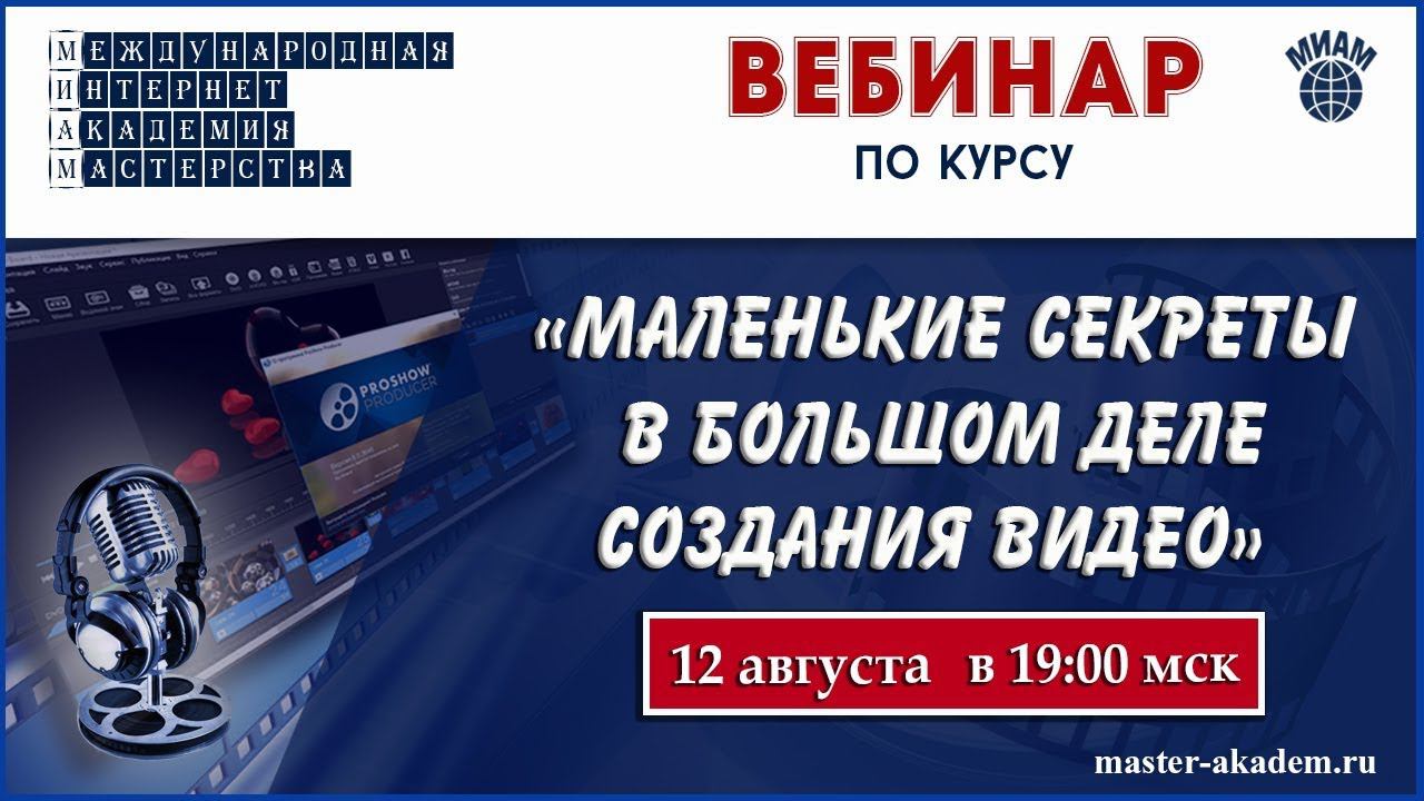 Создание видео, хорошего видео, процесс не простой, но если не проделать то, что нужно ожидать появление шедевра не приходится, да и в процессе его изготовления есть много нюансов. ******************************************************** С вами Международная Интернет-Академия Мастерства. Мы работаем с 2013 года. Обучаться онлайн – это современно и престижно. А ещё и удобно, просто, доступно. Убедитесь в этом вместе с нами! МНОГО ТВОРЧЕСКИХ КУРСОВ: 1) Сайт Академии - http://master-akadem.ru 2) Сайт студии ProshowFilmProduction - http://studiadoma.ru/ 3) Наш Онлайн-Кинотеатр: http://www.kinoclubonline.com/ Полезная информация: - Познавай новое с нами: http://master-akadem.ru/best_favorite/ - Работы наших учеников: http://studiadoma.ru/raboty-nashix-uchenikov - Виртуальный мир МИАМ: http://master-akadem.ru/virtualniy-mir-miam/ - Авторские стили: http://infoproshowfilmproduction.ru/page/stili - Проекты и Шаблоны: http://infoproshowfilmproduction.ru/page/proekty-i-shablony/ - Яндекс-Фотки: https://fotki.yandex.ru/users/po4ta-miam/albums/?ncrnd=3245 Наше представительство в соцсетях: ✱Паблик ВКонтакте: https://vk.com/publicmiam ✱Группа в ОК: http://ok.ru/internetacademymaster ✱Мы на Одноклассниках: http://ok.ru/miamterritoriyaznanii ✱Группа в Моем мире: https://my.mail.ru/community/miam/ ✱Группа на Facebook: https://www.facebook.com/groups/academiyamiam/ ✱Фан-страница МИАМ в Facebook: https://www.facebook.com/territorijaznanij2013/ ✱Мы на GOOGLE+: https://plus.google.com/+Master-akademRu ★ Канал студии: http://www.youtube.com/user/ProshowFilmProdction?sub_confirmation=1 ★ Зарабатывай на Ютуб вместе с нами: http://join.air.io/ProshowFilmPrduction Приходите к нам в Академию! Двери открыты для всех!