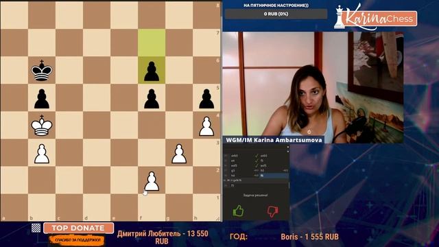 Поддержать канал: https://www.donationalerts.com/r/karinachess1 Стать спонсором канала и получить доступ к бонусам: https://boosty.to/karinachess Подписаться на мой канал: https://www.youtube.com/channel/UChor8u_hhgrjX2lt0QLzZHA?sub_confirmation=1 Подробная информация об обучающем курсе "Пешечные структуры" http://bit.do/pawns-structures Рестрим: https://www.twitch.tv/karinachess1 Рада приветствовать Вас на канале женского международного гроссмейстера, международного мастера Карины Амбарцумовой! Я - профессиональная шахматистка и тренер. Здесь вы сможете найти обучающие видеоуроки по шахматам, комментарии турниров, стримы моей игры в блиц шахматы. Подписывайтесь на мои странички в соц.сетях: ВКонтакте: https://vk.com/karinachessclub Telegram: https://t.me/karinachess Twitch: https://www.twitch.tv/karinachess1 Почта для связи: karinachess@mail.ru Мой сайт: http://chesscoach.ru/