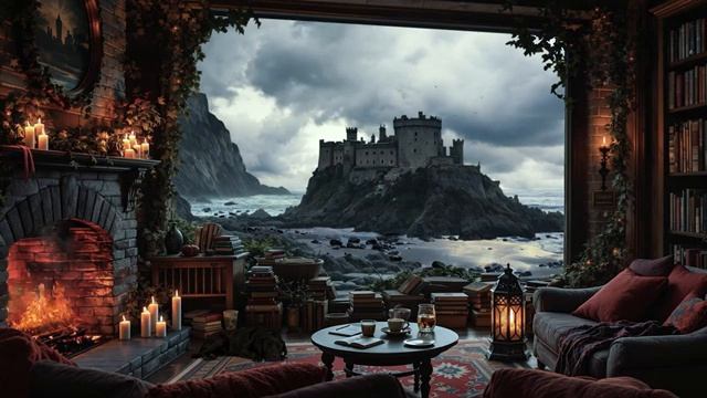 ....Уютная атмосфера у камина с шумом океана-Замок на берегу моря....