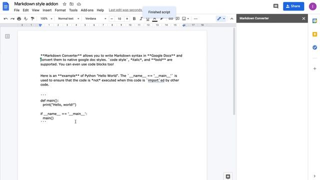 Markdown Converter is a simple Google Docs add-on. It converts the Markdown syntax in selected content into Google Docs styles.