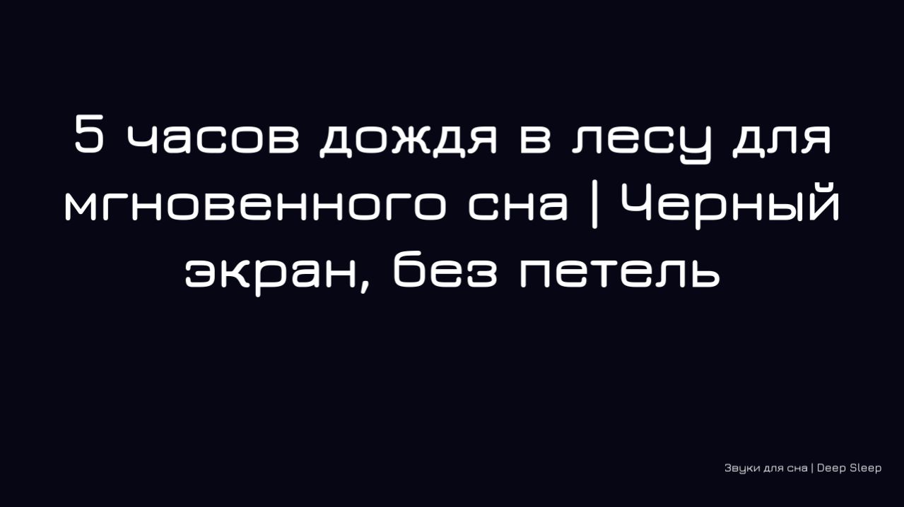 🌲🌧️ Мягкий шум лесного дождя создает идеальную атмосферу для быстрого засыпания и глубокого отдыха. Звуки капель, падающих на листву, уносят вас в уютное убежище среди природы, помогая отключиться от городской суеты и тревожных мыслей. 🔹 Полная 5‑часовая версия с чёрным экраном, без петель и затуханий – только чистый, непрерывный звук дождя в лесу, который не прервёт ваш сон. 📥 Если хотите слушать без рекламы и скачивать видео в высоком качестве, заходите на Boosty: https://boosty.to/deep_noise_sleep Подписывайтесь на канал и пишите, любите ли вы засыпать под звуки леса и дождя! 🌙 Евгений / Deep Noise Sleep Теги: дождь в лесу, лесной дождь, звуки дождя, для сна, 5 часов, мгновенный сон, глубокий сон, релаксация, белый шум, звуки природы, лес, черный экран, без рекламы, скачать, rain sounds, forest ambience