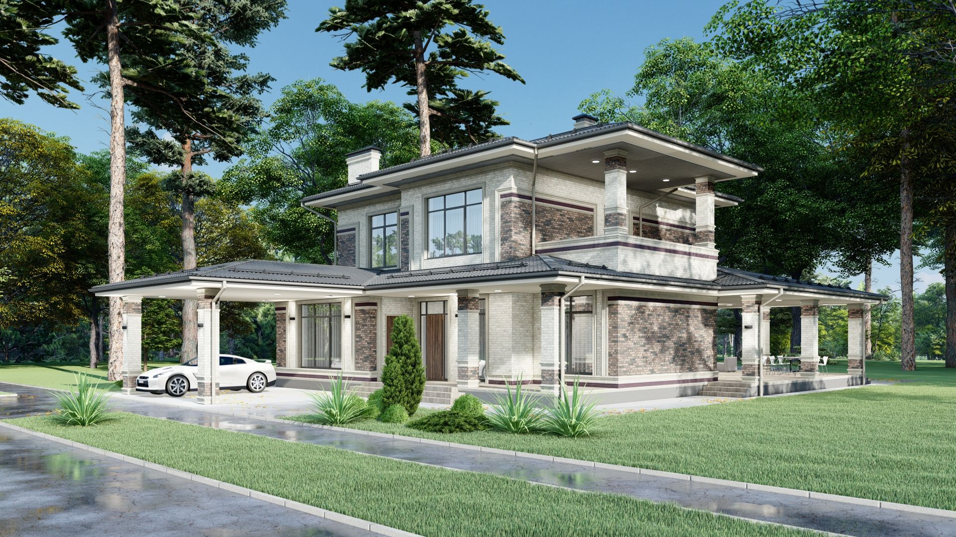 Проект (66_220) двухэтажного дома, со скатной кровлей, предлагает идеальное сочетание комфорта и стиля. Первый этаж предназначен для активной жизни и отдыха: здесь расположены просторные общественные помещения, кабинет, который может быть переоборудован в гостевую спальню и выход на широкую террасу с бассейном. На втором этаже находится приватная зона, включающая мастер-спальню с двумя гардеробными, а также две детские спальни, из холла предусмотрен выход на лоджию. Фасад дома, облицованный комбинацией кирпича ручной формовки белого цвета и с фиолетовым нагаром, дополнен декоративными молдингами из фибробетона, что придаёт ему утончённый и современный вид. https://www.behance.net/gallery/238720089/Bielefeld-220-m2 👉 сайт: https://artdominika.ru 👉 ВКонтакте: https://vk.com/dominika_krd 👉 Бихайнс: https://www.behance.net/artDomiNika 👉 Пинтерест: https://ru.pinterest.com/enronikaen/ 👉 Телеграм: https://t.me/+NGgoQfQ11hkyMjQy