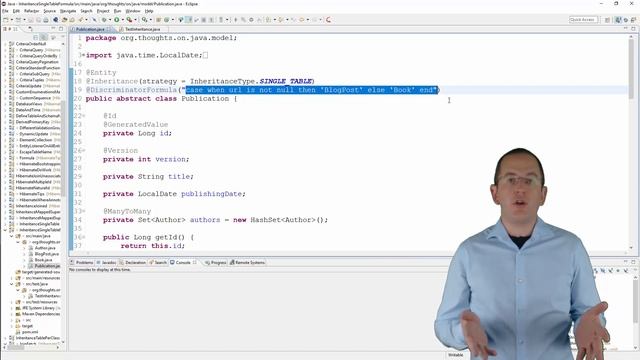 Get more recipes like this one in my new book Hibernate Tips: More than 70 solutions to common Hibernate problems: https://goo.gl/XfywNk In this video I will answer a common question about mapping inheritance hierarchies using the single table strategy. If you like this video, please give me your thumbs up and share it with your friends and co-workers. Like my channel? Subscribe! ➜ http://bit.ly/2cUsid8 Join the free Member Library: https://goo.gl/dtyIIC Read the accompanying post: https://thoughts-on-java.org/hibernate-tips-single_table-strategy-without-discriminator-column/ Want to connect with me? Blog: http://www.thoughts-on-java.org/ Twitter: https://twitter.com/thjanssen123 Facebook: https://www.facebook.com/thoughtsonjava #Hibernate #JPA #HibernateTips