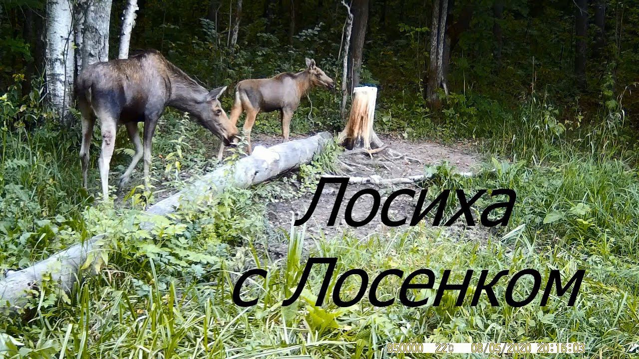 ЛОСИХА С ЛОСЕНКОМ. Видео с фотоловушки.