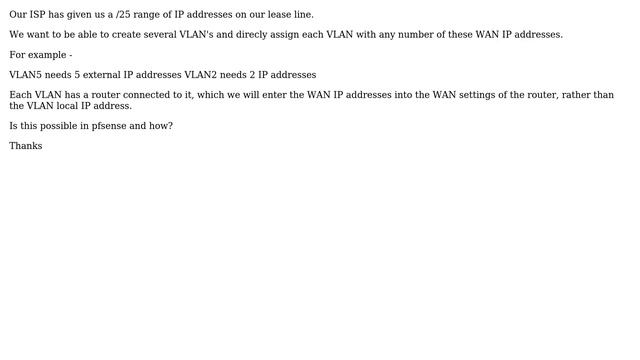 DevOps & SysAdmins: Use multiple WAN IP addresses on a single VLAN Helpful? Please support me on Patreon: https://www.patreon.com/roelvandepaar With thanks & praise to God, and with thanks to the many people who have made this project possible! | Content (except music & images) licensed under CC BY-SA https://meta.stackexchange.com/help/licensing | Music: https://www.bensound.com/licensing | Images: https://stocksnap.io/license & others | With thanks to user Tero Kilkanen (serverfault.com/users/210570), user dynamicuser (serverfault.com/users/173493), and the Stack Exchange Network (serverfault.com/questions/707669). Trademarks are property of their respective owners. Disclaimer: All information is provided "AS IS" without warranty of any kind. You are responsible for your own actions. Please contact me if anything is amiss at Roel D.OT VandePaar A.T gmail.com