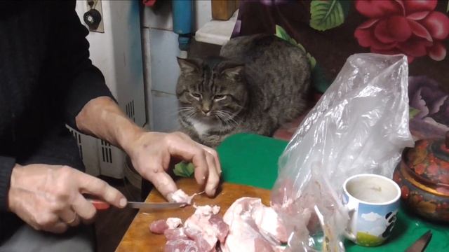 Нарезал мясо, а кот Вася помогал.