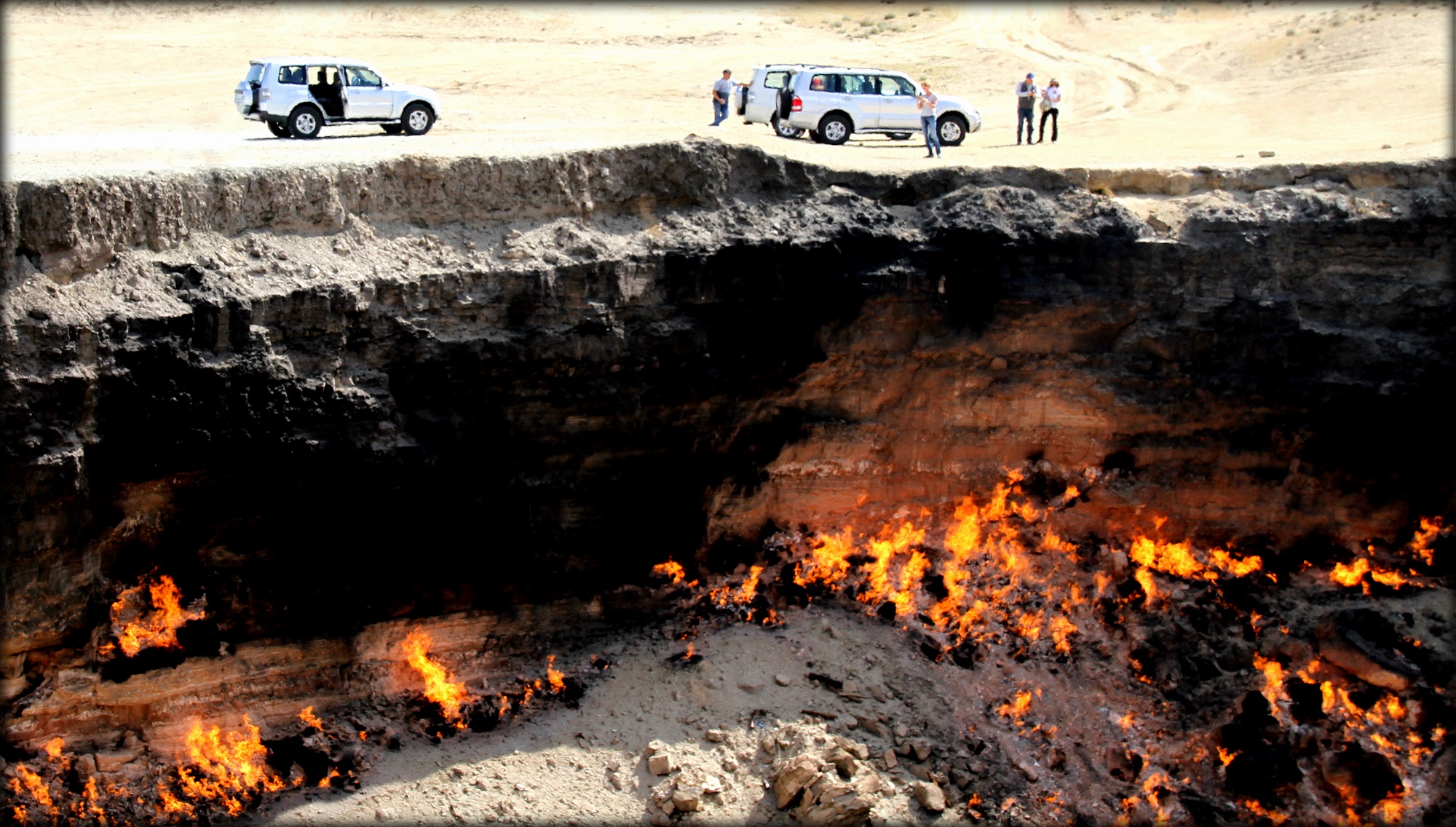Фрагменты путешествия по геологическим чудесам Туркмении. Одной из самых популярных и известных природных достопримечательностей Туркмении является «Газовый кратер Дарваза». Это провал на территории массивного месторождения природного газа в пустыне Заунгузские Каракумы. Почти полвека опасный участок охвачен огнём, привлекая многочисленных исследователей и туристов. Диаметр воронки составляет более 60 метров, глубина — около 30 метров. В народе локацию называют «входом в преисподнюю» или «адскими вратами». Слово Дарваза в переводе с персидского языка означает «врата». Рядом с поселением Дарваза в 1971 году исследователи обнаружили подземное скопление газа. Геологи решили оборудовать скважину для получения более точных данных. Практически сразу после углубления в грунт бур наткнулся на крупную подземную полость, куда провалилась вся рабочая площадка, включая транспорт, оснащение и саму вышку. При инциденте пострадавших не было, но жертвы могли вскоре появиться, поскольку из образовавшейся дыры мощным потоком выходил газ. Чтобы не допустить полномасштабной экологической катастрофы из-за отравления людей, флоры и фауны, яму подожгли. По расчетам геологов, обнаруженные запасы метана должны были иссякнуть всего через несколько дней. В результате горение растянулось на многие годы. Некоторые туркменские ученые уверены, что газовый кратер Дарваза образовался еще в 1960-х годах, но эта версия не является официальной. В 2004 году ближайшую деревню снесли, а её жителей переселили ближе к одноименной железнодорожной станции. В 2010 году эту необычную достопримечательность лично посещал президент страны, распорядившись засыпать провал или принять любые другие меры по ограничению утечки ценного природного ресурса. Несмотря на это, план действий так и не был разработан.