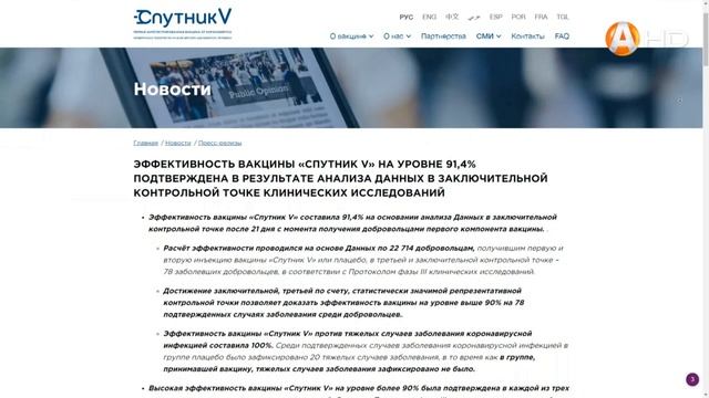 У Российской вакцины от коронавируса «Спутник –ВИ» п?