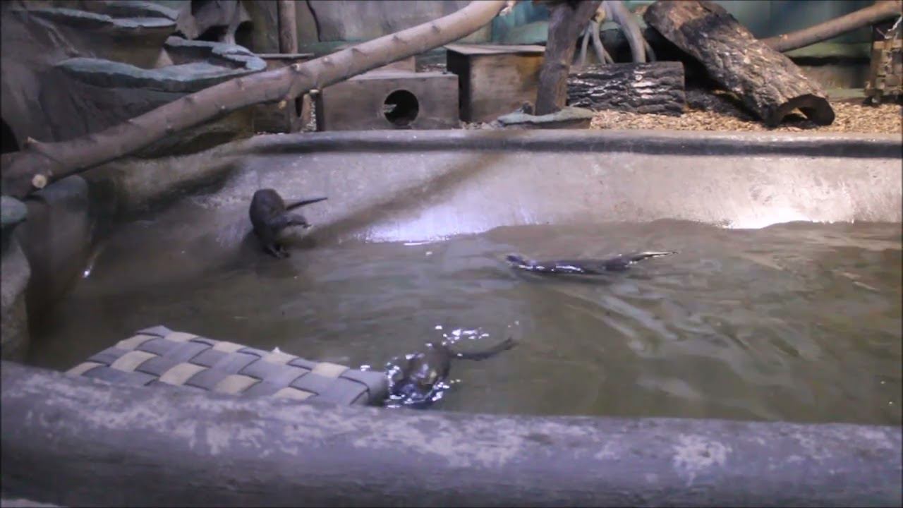 Азиатские бескоготные выдры плавают в бассейне и играют камушками 14.01.2024