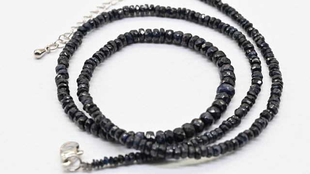 •Сапфир поделочного качества - корунд синий. •Не является ювелирным. •Длина бус 48см + 5см цепочка – удлинитель. •Размер бусин от 3*2мм до 5*4мм. •В наименовании указан средний вес. •На поверхности камня допустимо присутствие природных прожилок и раковин, что свойственно натуральному камню.