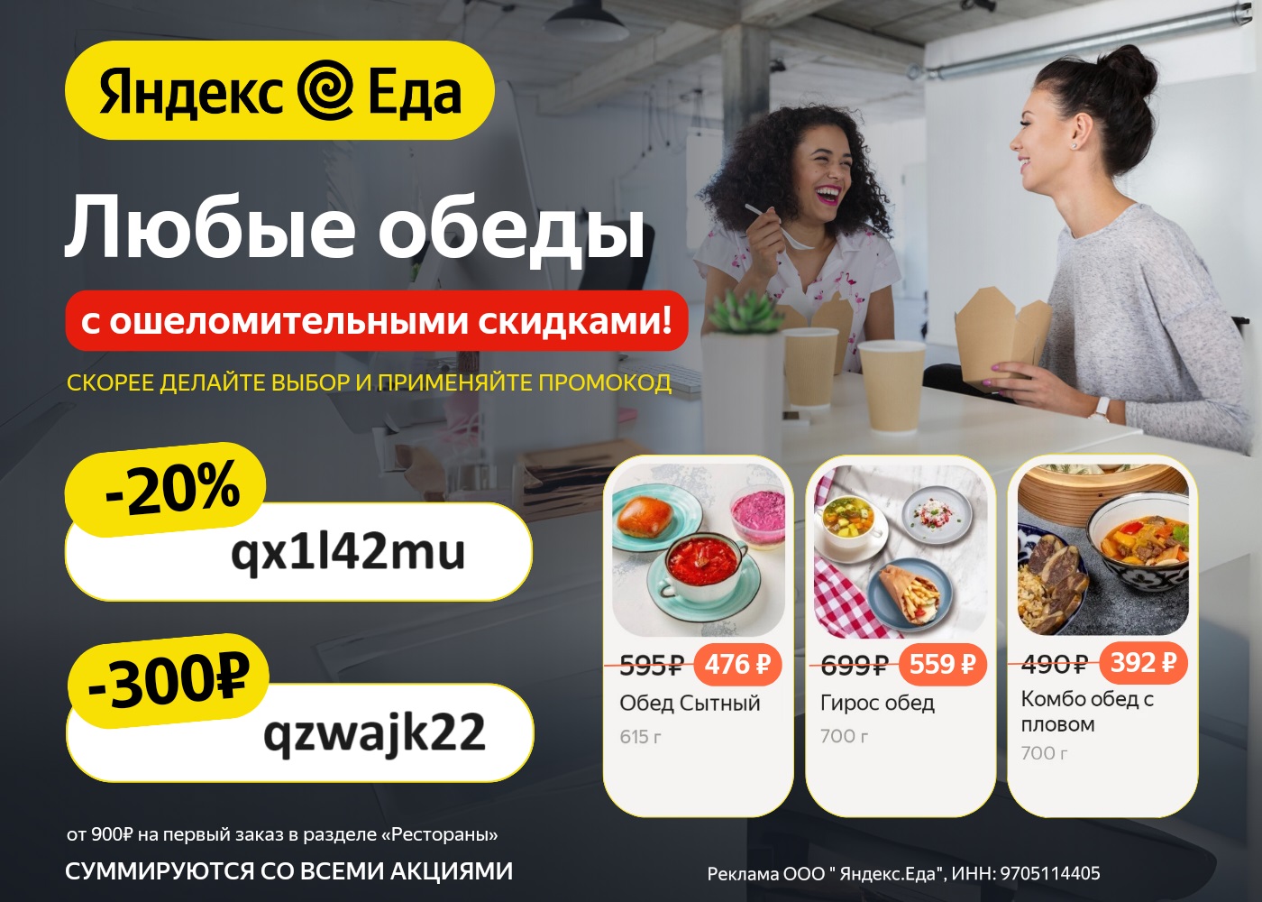 Доставка еды в любую погоду! Вьюга, метель, ливень, гололёд.... Яндекс Еда доставит еду в любую погоду. Переходите в приложение https://edayandex.prfl.me/skidki_sales_promo/0d7eae, выбирайте ваш любимый ресторан и делайте заказ. А с промокодами можно существенно сэкономить: скидка 20% - qx1l42mu скидка 300 ₽ - qzwajk22 Промокоды действуют на первый заказ от 900₽ в приложении и суммируются со всеми акциями.