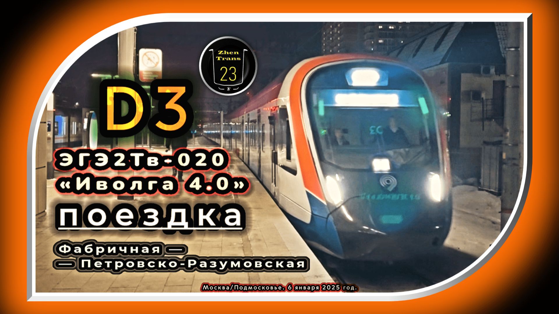 В этом видео я показал зимнюю ночную январскую поездку на электропоезде модели ЭГЭ2Тв-020 «Иволга 4.0» по линии третьего Московского Центрального Диаметра (D3) от «Фабричной» до «Петровско-Разумовской». Снято 6 января 2025 года. Поддержка моего канала - 2202 2023 6913 7413. Тайм-коды к видео: 00:00 – Начало. 00:25 – Платформа «Фабричная» Рязанского хода Казанского направления Московской железной дороги D3. Прибытие на Зеленоград-Крюково электропоезда ЭГЭ2Тв-020 «Иволга 4.0». 01:09 – Фабричная — Есенинская. 03:35 – Есенинская — Кратово. 05:50 – Кратово — Отдых. 08:13 – Отдых — Ильинская. 11:25 – Ильинская — Быково. 14:03 – Быково — Удельная. 16:57 – Удельная — Малаховка. 19:50 – Малаховка — Красково. 22:18 – Краскоао — Томилино. 24:42 – Томилино — Панки. 27:50 – Панки — Люберцы-1. 30:44 – Люберцы-1 — Ухтомская. 34:06 – Ухтомская — Косино. 36:15 – Косино — Выхино. 39:08 – Выхино — Вешняки. 41:05 – Вешняки — Плющево. 43:32 – Плющево — Перово. 45:21 – Перово — Андроновка. 48:11 – Андроновка — Авиамоторная. 50:23 – Авиамоторная — Сортировочная. 53:06 – Сортировочная — Электрозаводская. 56:13 – Электрозаводская — Митьково. 1:00:43 – Митьково — Останкино (без остановки на платформе «Рижская»). 1:10:39 – Останкино — Петровско-Разумовская. 1:14:11 – Платформа «Петровско-Разумовская» Ленинградского направления Октябрьской железной дороги. Отправление на Зеленоград-Крюково ЭГЭ2Тв-020 «Иволга 4.0». 1:15:02 – Концовка. VK страница: https://vk.com/evgeniynaumov23 Telegram-канал: https://t.me/ZhenTrans23 Telegram-группа: https://t.me/zhentrans23chat Дзен: https://dzen.ru/zhentrans23 RUTUBE: https://rutube.ru/channel/23921395/ YouTube: https://www.youtube.com/@zhentrans23/videos