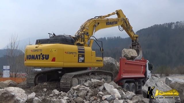 Экскаватор KOMATSU PC 290 11 загружает камни в грузовик.