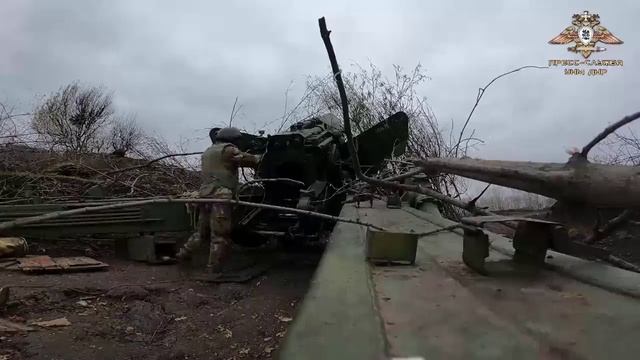 Артиллерийские орудия Первой Славянской бригады бьют снарядами калибра 152мм по позициям противника, поддерживая действия пехоты, уничтожая пункт временной дислокации ВСУ. ----------------------------------------— https://t.me/nm_dnr/9384