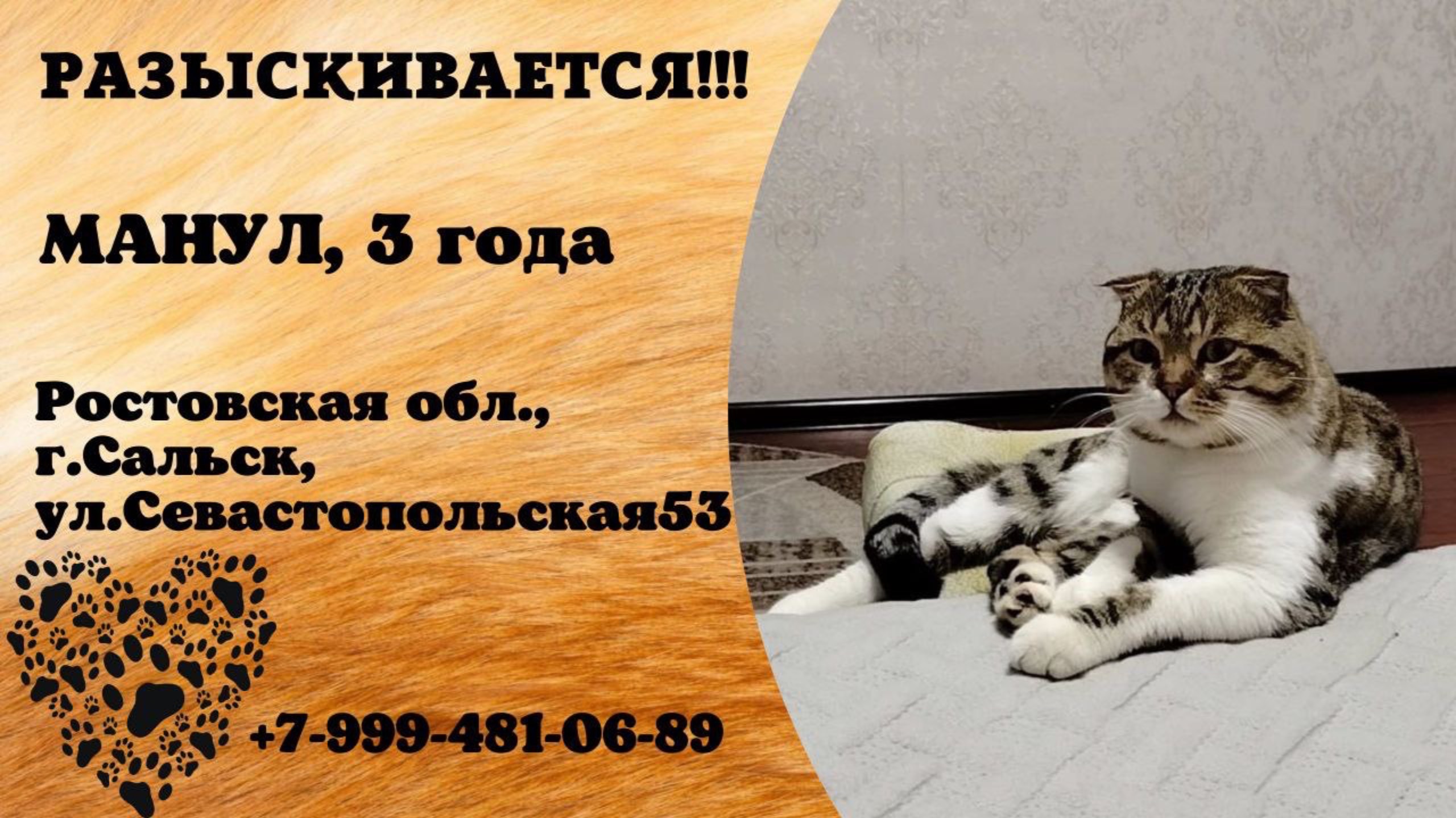 Пропал кот! МАНУЛ, 3 года. Ростовская обл., г.Сальск.