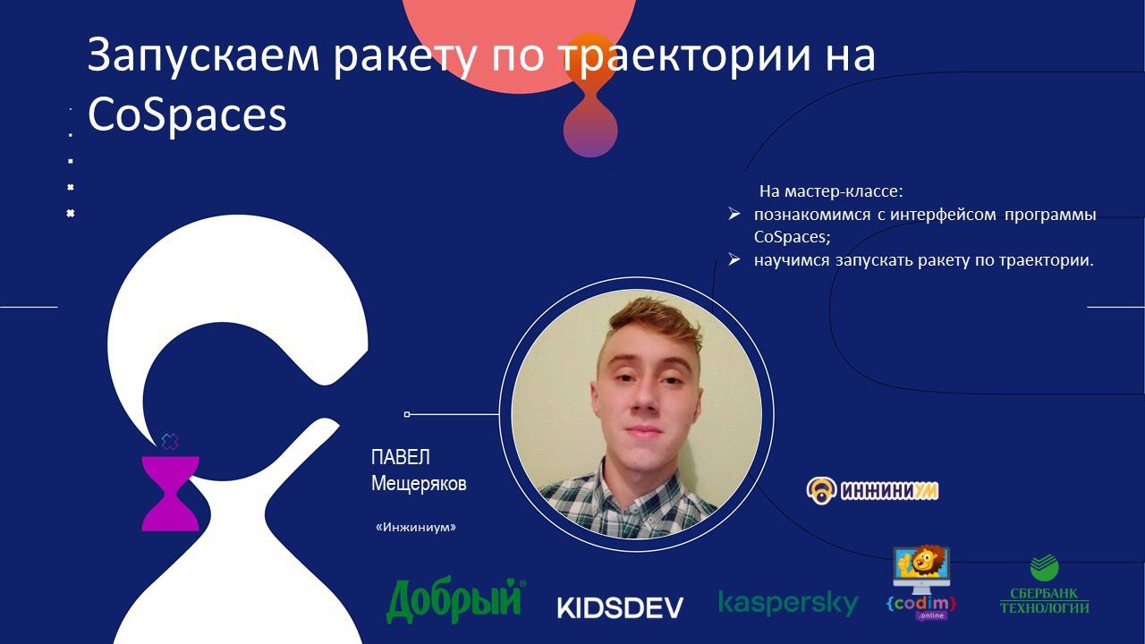 Мастер-класс «Инжиниум» «Запускаем ракету по траектории на CoSpaces». На мастер-классе: познакомимся с интерфейсом программы CoSpaces; научимся запускать ракету по траектории. Спикер: Павел Мещеряков Преподаватель курсов по программированию в клубе научно-технического творчества «Инжиниум». Для участия нужно: Заранее зарегистрироваться на платформе CoSpaces: https://cospaces.io/edu/. Инструкция по регистрации на платформе тут: https://drive.google.com/file/d/1LOIk-VRwhlC4Y-cj43bMpknaVa6n_5k9/view. Подробнее познакомиться с курсом Павла можно на сайте: https://inginium.ru/.