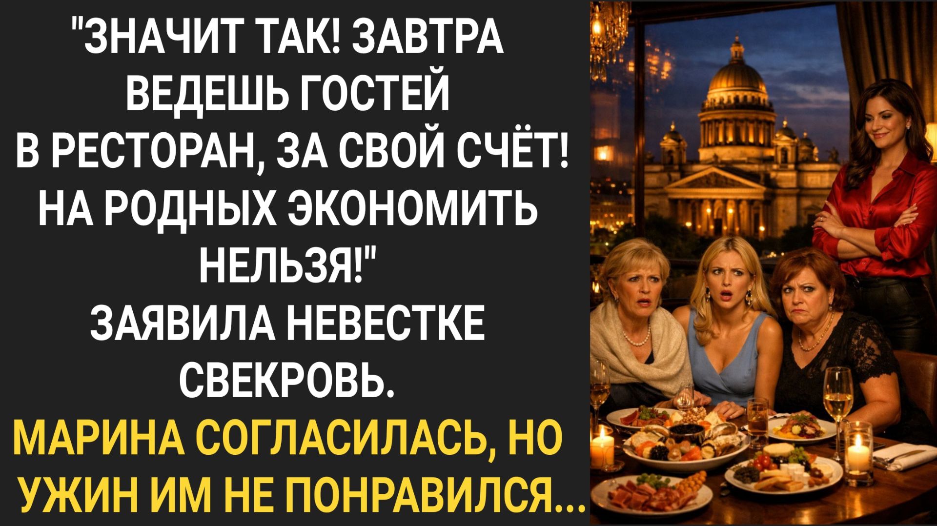 "Значит так! Завтра ведешь гостей в ресторан, за свой счет! На родных экономить нельзя!" Заявила невестке свекровь. Марина согласилась, но ужин им не понравился... Смотрите новую жизненную историю! Подписывайтесь на канал и пишите комментарии, обсудим ситуацию вместе!