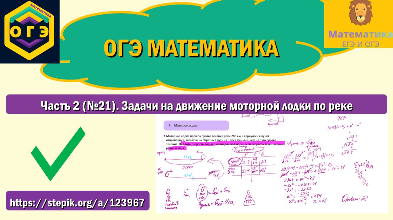 Продолжение на степике: https://stepik.org/a/123967. Вся теория и разбор задач, которые точно встретятся на ОГЭ по математике! ТГ-канал: t.me/ege_oge_maths. В видео разбираем Задание 21 второй части: учимся решать задачи повышенной сложности, работаем с оформлением на примере типового задания: Моторная лодка прошла против течения реки 288 км и вернулась в пункт отправления, затратив на обратный путь на 3 часа меньше, чем на путь против течения. Найдите скорость лодки в неподвижной воде, если скорость течения реки равна 4 км/ч. "