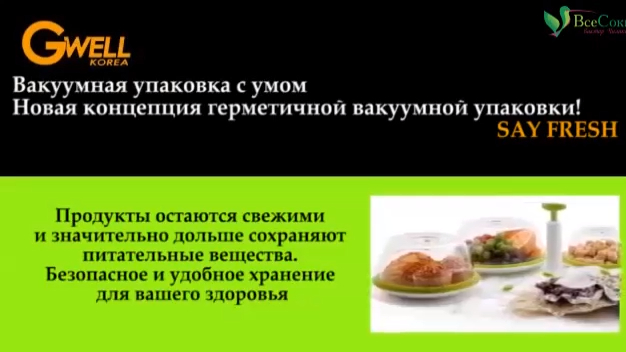 Ручной вакуумный упаковщик Say Fresh Gwell SF-1100 – это элегантное и простое в использовании устройство, которое позволяет за считанные секунды герметично упаковать продукты. Пользователь может полностью откачать воздух из вакуумных крышек и пакетов, сделав всего десять движений. Упакованные продукты остаются предельно свежими и значительно дольше сохраняют свои полезные свойства и вкусовые качества. В комплекте 3 вакуумные крышки (колпака) разного размера и 4 многоразовых пакета. Видеоролик от 27.10.2015 Аппарат на сайте «Все Соки»: http://vsesoki.ru/collection/ruchnye/product/ruchnoy-vakuumnyy-upakovschik-say-fresh-gwell-sf-1100?rtube http://vsesoki.ru?rtube – ООО «Все Соки», официальный импортёр и российский дистрибьютор техники для здорового образа жизни. ☎ Заказать ручные вакууматоры, шнековые соковыжималки, домашние мельницы, профессиональные блендеры, автоматические проращиватели, надёжные дегидраторы, кухонные аксессуары и другую технику для здорового питания с бесплатной доставкой по РФ: +7 (495) 134-11-44 – в Москве +7 (812) 389-33-66 – в Санкт-Петербурге ⠀8 (800) 33-33-627 – по всей России (звонок бесплатный!) Сюрприз для подписчиков! Подпишитесь на наш канал https://rutube.ru/video/person/1735077 и при оформлении заказа на сайте «Все Соки» используйте секретное слово РУТУБ. Наглядная инструкция по использованию кодового слова: https://clck.ru/EtNNi