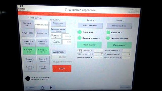 Данная установка осуществляет наплавку на поверхность трубы никель-молибденового сплава с целью улучшения её теплостойкости. Наплавка осуществляется при помощи двух горелок пошагово или непрерывно (по винтовой траектории) перемещения производятся посредством пяти сервоприводов. Система управления построена на: - панельный ПЛК Lenze p500; - сервопреобразователи Lenze 8400 TopLine; - сварочные преобразователи Fronius MIG/MAG; - пневмоостров Camozzi серии H; - выносной пульт Delta DOP-H подключенный через шлюз ModBUS RTU - CANopen; - IO-станция Lenze EPM-Sxxx IO-system 1000. Взаимодействие между устройствами осуществляется по шине CANopen.