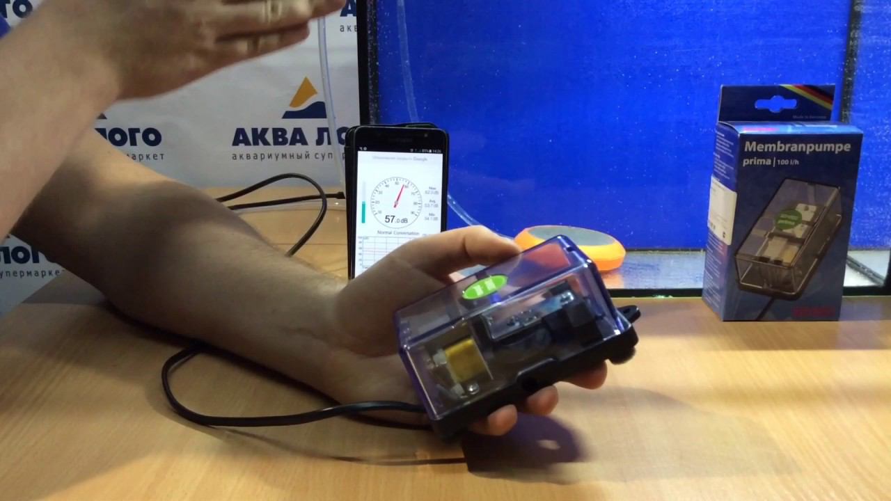 Ведущий специалист супермаркета "Аква Лого на ВДНХ" Илья Жучков проводит тестирование на уровень шума пяти компрессоров для аквариума различных производителей: Prime, Tetra, Schego и Eheim