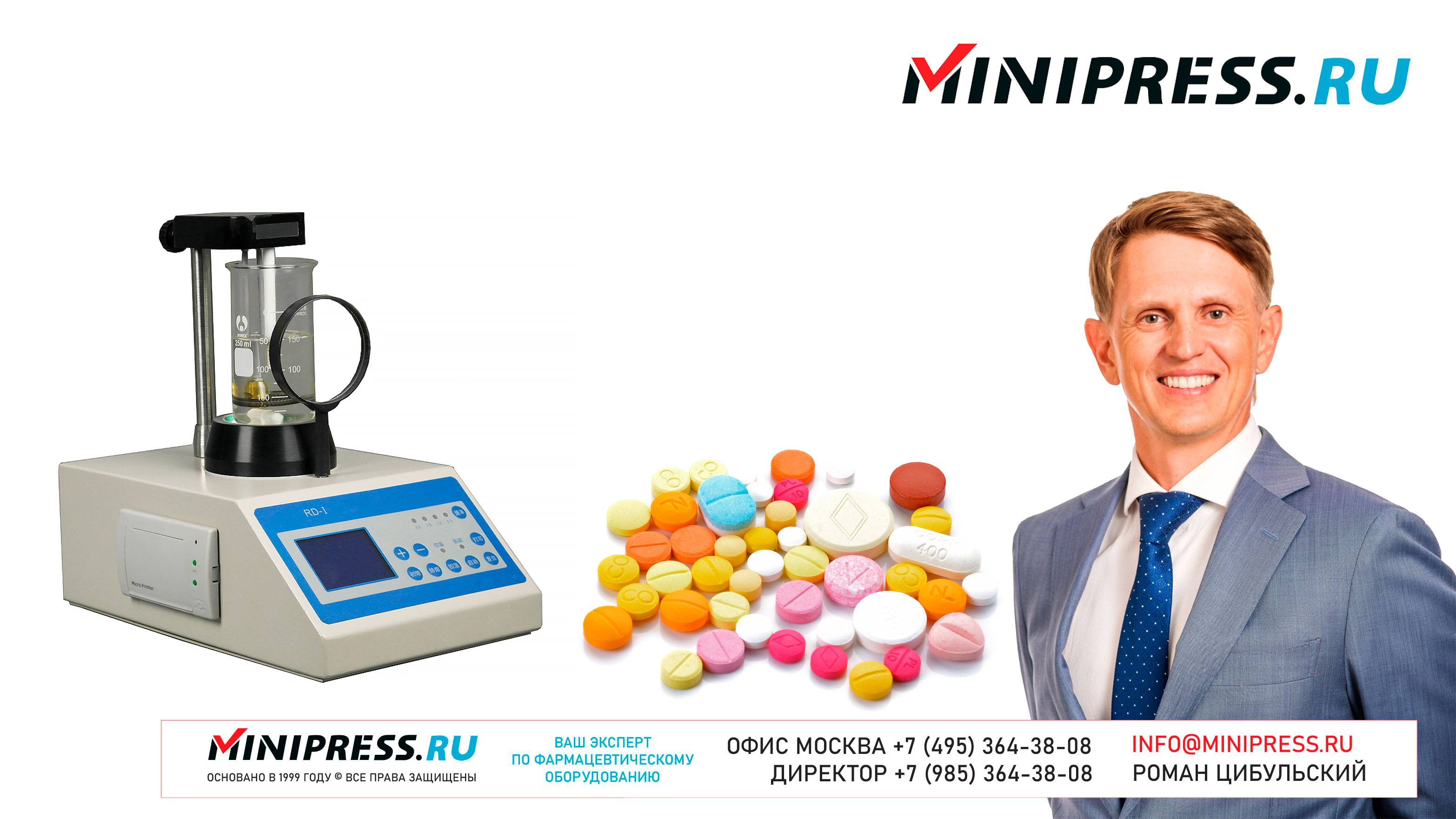 Лабораторный анализатор точки плавления лекарств RD-01 https://Minipress.ru/katalog/ Фармацевтическое оборудование. Специалисты в фармацевтическом оборудовании и технологиях производства лекарств. Более 20 лет оказываем нашим клиентам помощь в выборе, поставке, наладке различного фармацевтического оборудования! Вы в поиске надежного поставщика оборудования? Мы предоставим вам лучший сервис 24/7. Собрана лучшая команда профессионалов в фармацевтической отрасли и налажены стабильные связи с лучшими производителями. Мы не только продаем, но и производим многие модели оборудования Директор компании Минипресс Роман Цибульский Поставка фармацевтического оборудования в Россию Пишите: info@minipress.ru Телефон +7(495)364-38-08; Мобильный +375(29)308-00-00 Россия, Москва Skype: RomanTsibulsky; ICQ: 310-134-490 Подписывайтесь на наш видео канал на Youtube https://youtube.com/user/wwwMinipressru Обновленный сайт https://Minipress.ru Каталог оборудования https://Minipress.ru/katalog/ МЫ В СОЦИАЛЬНЫХ СЕТЯХ G+ https://plus.google.com/+RomanTsibulsky/ FB https://facebook.com/roman.tsibulsky YOUTUBE https://youtube.com/user/wwwMinipressru IN https://ru.linkedin.com/pub/roman-tsibulsky/a6/933/661 БОЛЬШОЙ КАТАЛОГ ФАРМАЦЕВТИЧЕСКОГО ОБОРУДОВАНИЯ https://minipress.ru/katalog/ Постоянно обновляемый каталог различного фармацевтического оборудования с фотографиями, описаниями, видео и ценами. ПЕРСОНАЛЬНЫЙ МЕНЕДЖЕР 24 ЧАСА https://minipress.ru/katalog/ Вы общаетесь по всем вопросам, с момента первой консультации и до получения оборудования, с одним специалистом. СПЕЦИАЛИСТЫ И ТЕХНОЛОГИ https://minipress.ru/katalog/ Имеем обширные связи в фармацевтической среде, найдем любого специалиста, поможем с освоением оборудования и технологий. ОБСУЖДЕНИЕ ВАШИХ ИДЕЙ ПО ПРОИЗВОДСТВУ ПРОДУКЦИИ https://minipress.ru/katalog/ Поможем в оценке ваших идей. Большой опыт в организации различных производств и выпуске продукции. Ценные советы. ФАРМАЦЕВТИЧЕСКОЕ ОБОРУДОВАНИЕ Мы поставили перед собой задачу, помогать нашим клиентам в правильном выборе фармацевтического оборудования. Многолетний опыт подобной деятельности показывает, что многие клиенты сталкиваются, в первую очередь, с непониманием технологического процесса. Покупка оборудования должна быть финальной точкой после подробного обсуждения задачи, консультацией с производителем оборудования, отправкой сырья и материалов на фабрику, тестирования в работе. ДЛЯ ТАБЛЕТОК https://minipress.ru/katalog/category/farmacevticheskoe_oborudovanie/ Смешивание порошков, гранулирование, прессование, обеспыливание, покрытие оболочками, фасовка, упаковка, счет, нанесение логотипов ДЛЯ ЖЕЛАТИНОВЫХ КАПСУЛ https://minipress.ru/katalog/category/farmacevticheskoe_oborudovanie/kapsulyatory-dlya-tverdyh-zhelatinovyh-kapsul/ Фасовка порошков и масел, обеспыливание, счет и фасовка, упаковка, нанесение логотипов. ФАСОВКА И УПАКОВКА https://minipress.ru/katalog/category/upakovochnoe_oborudovanie/ Упаковка в пластиковые и стеклянные флаконы, блистер, фольгу, ламинированную бумагу, стеклянные ампулы, саше, стрипы, тубы, тюбики, контурную ячейку. ТЕХНОЛОГИЧЕСКОЕ https://minipress.ru/katalog/category/eksperimentalnoe-oborudovanie/ Лабораторное, аналитическое, подготовительное, отдельные машины и линии под ключ. СФЕРЫ ДЕЯТЕЛЬНОСТИ Наша компания занимается множеством направлений фармацевтического бизнеса! Предлагаем Вам посетить страницы нашего сайта https://www.Minipress.ru по различным специализациям. ОБОРУДОВАНИЕ ДЛЯ НАКЛЕЙКИ ЭТИКЕТОК НА БУТЫЛКИ АМПУЛЫ ФЛАКОНЫ https://minipress.ru/katalog/oborudovanie-s-otzyvami/oborudovanie-dlya-naklejki-etiketok-na-butylki-ampuly-flakony/ Автоматическое этикетировочное оборудование для этикеток на клеевой осн