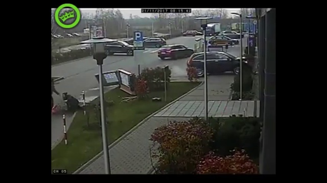 Перепутала педали что ли..где-то в Польше, водитель сбил пешеходов и врезался в здание.