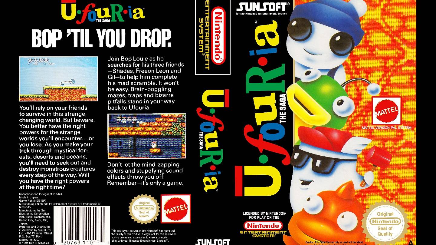 "UFOURIA: THE SAGA" - приключенческая видеоигра 1991 года, разработанная и изданная в Японии ("HEBEREKE") и Европе компанией SUNSOFT для игровой приставки NES. Это первая часть франшизы "HEBEREKE", в которой почти каждая игра отличается от предыдущих. Управляя похожим на человека персонажем по имени Боп-Луи в мире, состоящем из взаимосвязанных локаций, игрок исследует его и ищет предметы и усилители в духе "METROID" и "BLASTER MASTER", сражаясь с боссами и мини-боссами. Во время игры игрок находит трёх друзей главного героя, каждый из которых становится игровым персонажем и обладает уникальными навыками, позволяющими игроку добраться до ранее недоступных локаций. Игра была создана в токийском подразделении SUNSOFT в период, когда компаниям-разработчикам программного обеспечения требовался талисман, представляющий их. Из-за отсутствия серии и желания создать собственных персонажей SUNSOFT решила объединить игру в одну. После выхода игры в Японии начались планы по её международному релизу. "UFOURIA: THE SAGA" была представлена в журналах в виде предварительных обзоров и рецензий, а также в виде готовой к игре версии для посетителей WCES в 1991 году, но североамериканская локализация была отменена после того, как Sunsoft of America не одобрила игру из-за причудливого дизайна персонажей. Игра была выпущена в Европе и Австралии в 1992 году с различными изменениями по сравнению с оригинальной японской версией, такими как другой сюжет, а также изменённые имена персонажей и спрайты. Из-за ограниченного выпуска европейская версия стала довольно востребованной и считается популярным предметом на рынке коллекционных игр. Сюжет игры отличается в зависимости от региона; в оригинальной японской версии рассказывается о персонаже, похожем на пингвина, по имени Хебе, который ищет своих коллег О-Чана, Сукэдзаэмона и Дженнифер, попавших в прошлое и будущее во время масштабной войны, чтобы сразиться с инопланетянином по имени Уньон и вернуться на свои родные планеты. В западной локализации Боп-Луи и его друзья Фрион-Леон, Шейдс и Гил являются членами семьи 21-го века и живут в вымышленном мире. Боп-Луи натыкается на кратер, в который падают его друзья. Боп-Луи забирается внутрь, но внезапно теряет сознание. Он узнаёт, что должен найти всех троих своих друзей, которые страдают от амнезии и воспринимают Боп-Луи как угрозу. Как только все четверо соберутся вместе, группа должна будет собрать три ключа, победив стражей, чтобы открыть ворота и сразиться с Юнионом.
