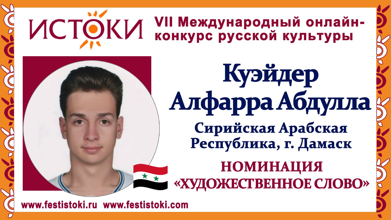 Куэйдер Алфарра Абдулла, 18 лет. Сирия, г.Дамаск. "Стансы"