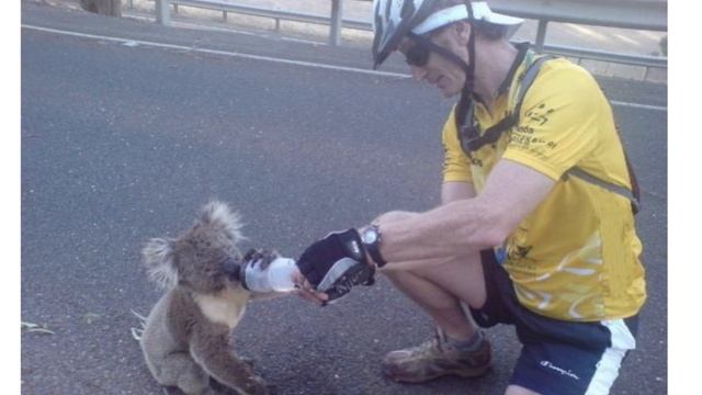 Коала пьет воду из бутылки