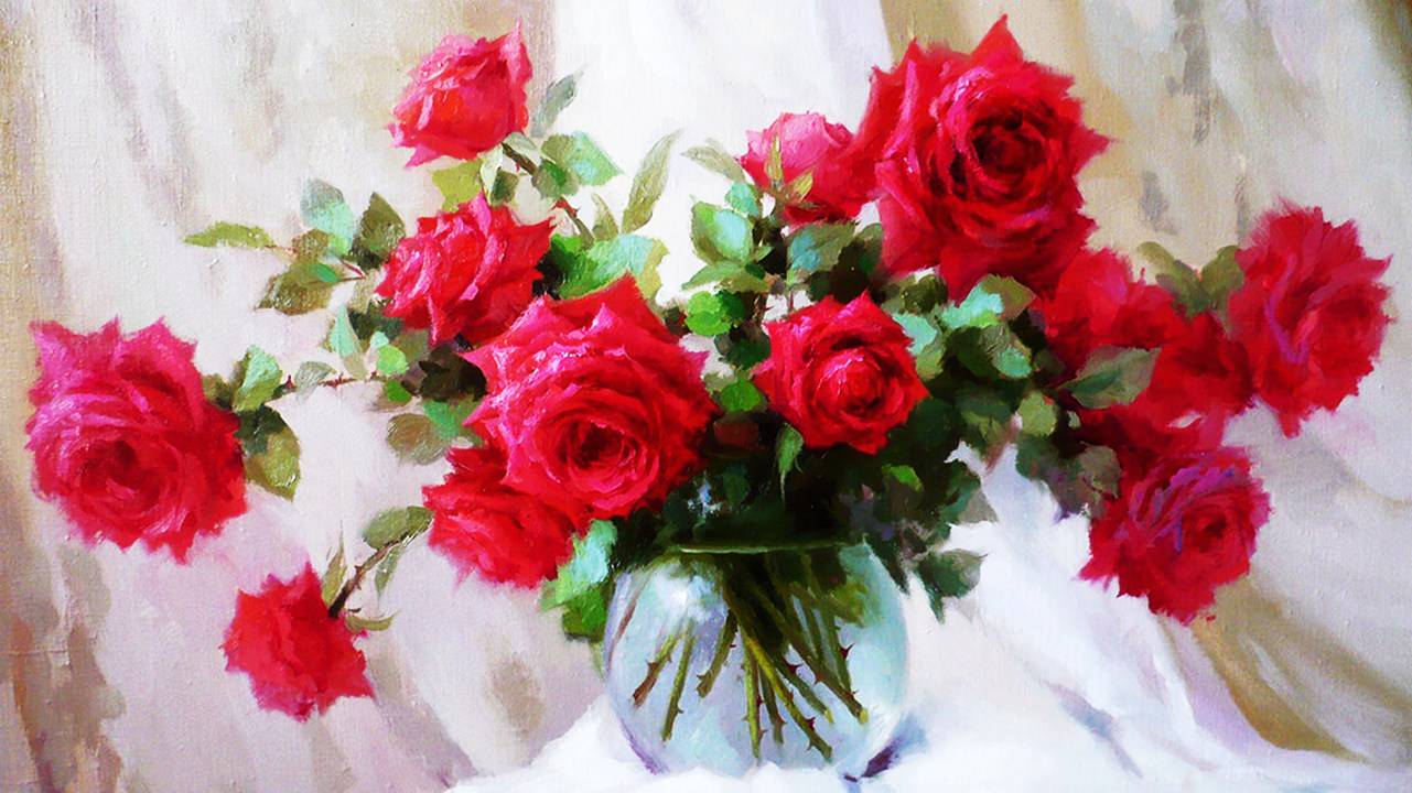 Изящные натюрморты художника Юрия Николаева Уроженец Пензенской губернии, художник Юрий Викторович Николаев родился 27 апреля 1964 года. Талантливый живописец, автор ярких живых работ: пейзажи, натюрморты, душистые букеты… В 1988 году молодой художник окончил Пензенское художественное училище им. К.А. Савицкого, а уже в 1991 году получает специальность «архитектор» на архитектурном факультете Пензенской архитектурно-строительной академии. С 1996 года работы художника участвуют в региональных и всероссийских выставках. Картины Юрия Николаева привлекают свежестью, ненавязчивой легкостью красок. Характерная для автора манера письма позволяет тонко передавать текстуры, схватывая в живописном образе цельность и органичность мира. Возможно, поэтому «коньком» Николаева стали изящные натюрморты с розами и пионами. Цветы действительно кажутся живыми, выступая над поверхностью холста! Многие зрители заново открывали для себя великолепие роз и пионов, их роскошь и удивительную глубину чувств, таящихся в атласных лепестках. Столь яркое предпочтение автора во многом говорит не только о его высоком мастерстве, но и тонком художественном вкусе, таланте видеть больше, чем укладывается в рамках обыденности. Музыка:Сергей Чекалин - Дождь и солнце