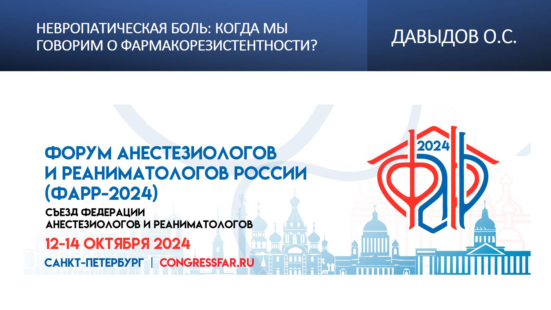 Видеозапись ФАРР-2024, XXII съезд Федерации анестезиологов и реаниматологов 12-14 октября 2024, Санкт-Петербург. Олег Сергеевич Давыдов "Невропатическая боль: когда мы говорим о фармакорезистентности?" Информация, размещенная на канале, предназначена исключительно для медицинских специалистов