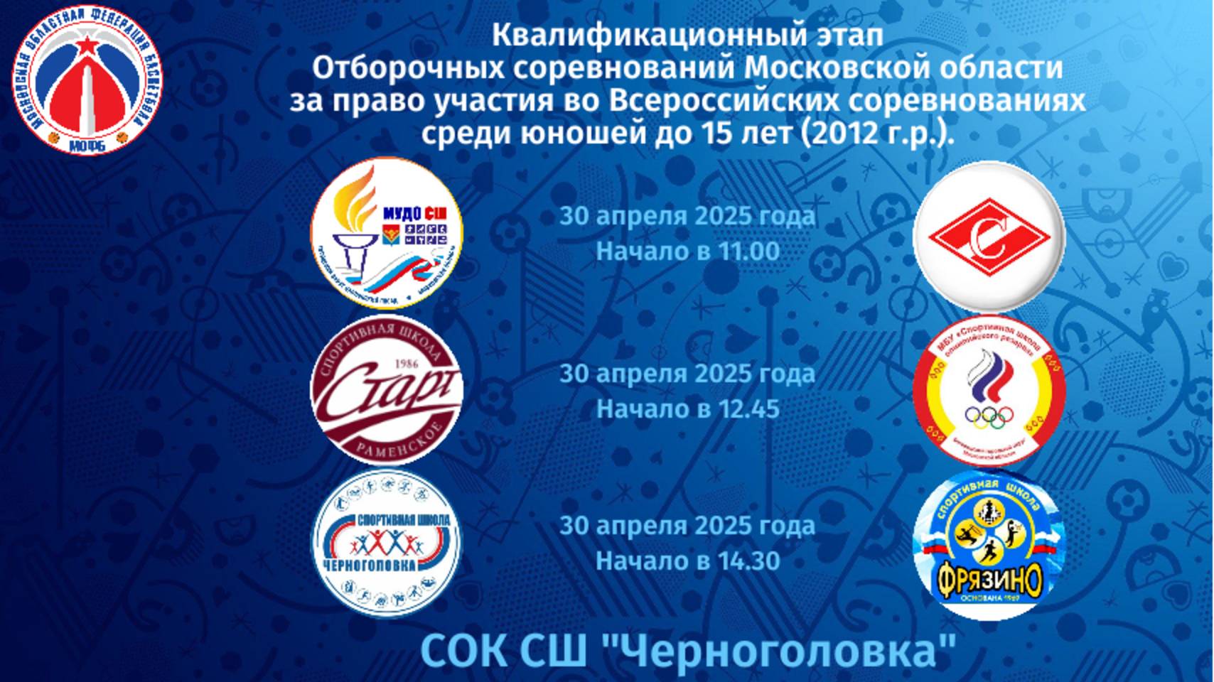 📍 Место проведения: Московская область, г. Черноголовка, ул. Центральная, д.1, Спорткомплекс 🔥🏀 БАСКЕТБОЛЬНЫЙ ШТОРМ НАКРЫВАЕТ МОСКОВСКУЮ ОБЛАСТЬ 🏀🔥 Готовьтесь к эпицентру баскетбольных сражений! Юные титаны спорта сойдутся в ожесточенной борьбе за право представлять Московскую область на Всероссийских соревнованиях! 🏆 🏀🏆 Представляем расписание квалификационного этапа отборочных соревнований Московской области за право участия во Всероссийских соревнованиях среди юношей до 15 лет (2012 г.р. и моложе) сезона 2025-2026 г.г. 30 апреля: 06:06 Павловский Посад - Люберцы 01:41:00 Раменское - Богородский 03:26:40 Черноголовка - Фрязино