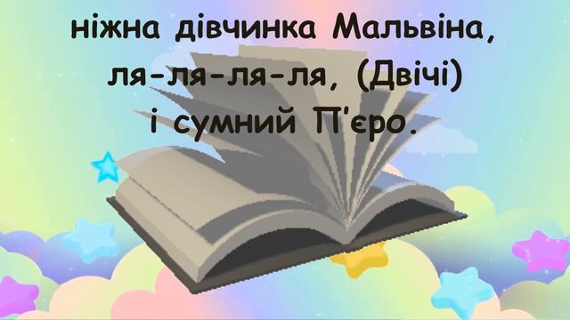 Мистецтво, НУШ, 2 клас за підручником О. Калініченко мінус тут: https://youtu.be/vTwBTGpkVQs 1. У чудовий світ казковий, в таємничий світ відкриває двері школа нам з дитячих літ. І веде нас по доріжках за дзвінком дзвінок, сторінки гортає книжка, ля-ля-ля-ля, (Двічі) добрі гноми, Білосніжка, ля-ля-ля-ля, (Двічі) надають урок. 2. Карабаси-Барабаси теж у гості звуть. Наші друзі в кожнім класі у книжках живуть. І навчить нас неодмінно, як творить добро, неслухняний Буратіно, ля-ля-ля-ля, (Двічі) ніжна дівчина Мальвіна, ля-ля-ля-ля, (Двічі) і сумний П’єро. 3. П’ятачок із Вінні-Пухом — хто не радий їм? Ця весела книжка другом стала нам усім. Навіть сонце здивувалось, що не видно нас. А ми просто зачитались, ля-ля-ля-ля, (Двічі) ми читали і сміялись, ля-ля-ля-ля, (Двічі) веселився клас