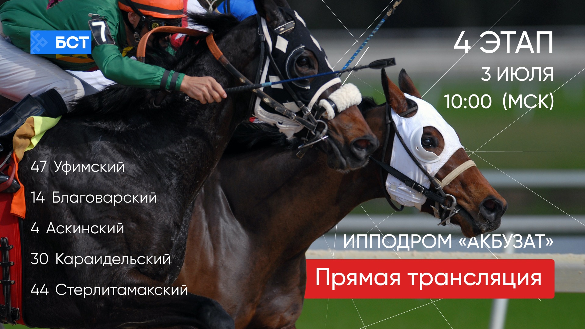 ?3 июля в 10:00(МСК) состоится четвёртый этап конноспортивного турнира «Терра Башкирия» 2021 среди жокеев-любителей муниципальных районов Республики Башкортостан. ⠀⠀ ?Районы участники турнира: — Уфимский — Благоварский — Аскинский — Караидельский — Стерлитамакский — Куюргазинский ⠀⠀ ?Смотрите турнир «Терра Башкирия» на телеканале БСТ и в наших социальных сетях. Начало трансляции 3 июля в 12:00.