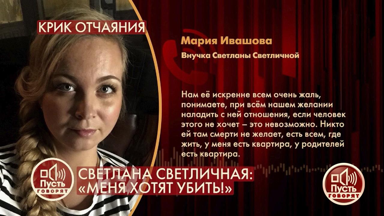 Внучка Светланы Светличной считает, что актриса хочет напомнить о себе и поэтому заявляет, что родственники хотят ее убить.